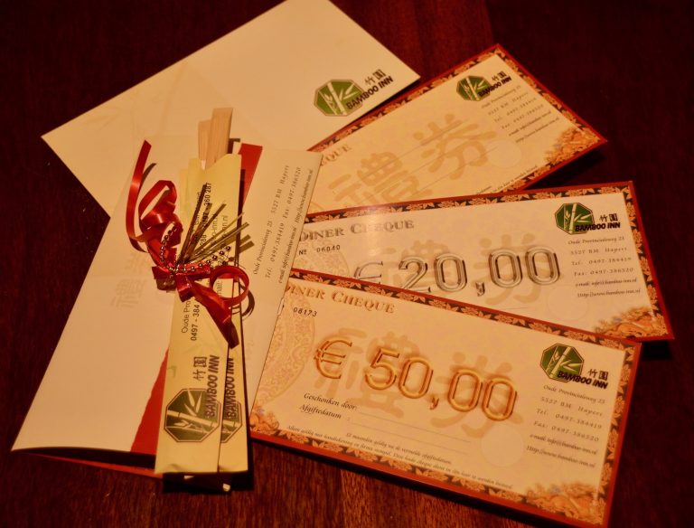 Voor een smakelijke verrassing bieden wij ook een diner cheque als cadeau voor speciale gelegenheden. Deze is te gebruiken is bij ons in het restaurant, buffet en afhaal. Vraag naar onze diner cheque bij uw volgende bezoek!